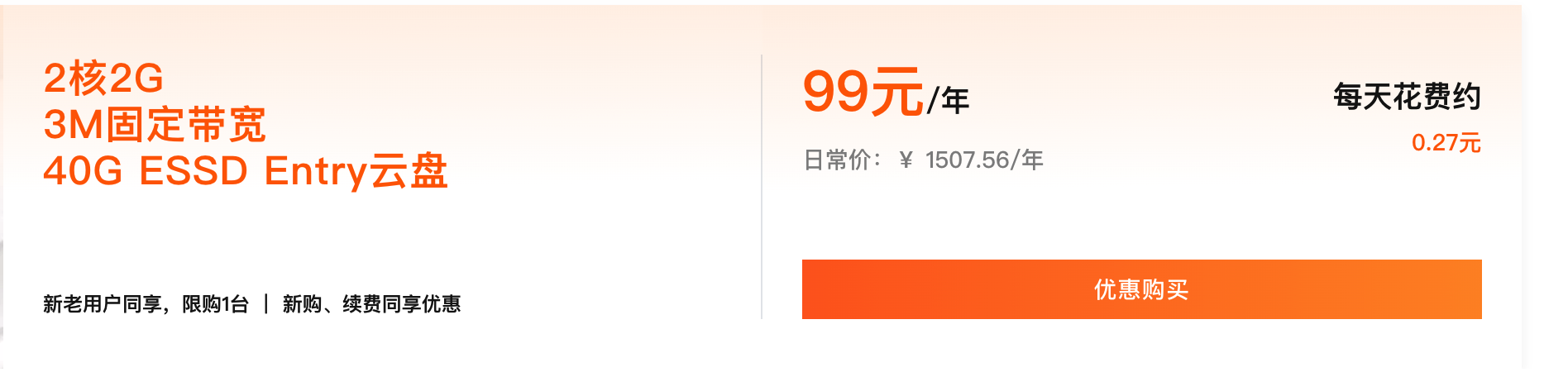 2、阿里云服务器,目前有活动99元/一年,到期是可以原价续费4年,过期了可以换其他厂商服务器,做好迁移工作,这里主要利用公网IP做代理作用